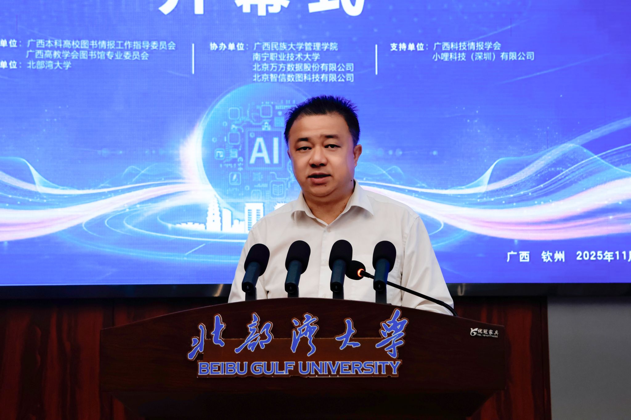 开幕式上,北部湾大学党委常委、副校长闫松银致欢迎辞。他表示,AI 浪潮下,“AI 素养”已成为智能时代信息素养的核心延伸,大赛以“AI + 信息素养”为主题,精准契合时代脉搏。他寄语参赛学子,要练就“智慧猎手”的甄别眼光、掌握“卓越搭档” 的协同艺术、点燃“勇敢先锋”的创新引擎、筑牢“坚定守护者”的伦理基石,在人机协同中锻造驾驭工具的觉悟,而非被工具奴役。