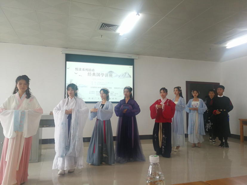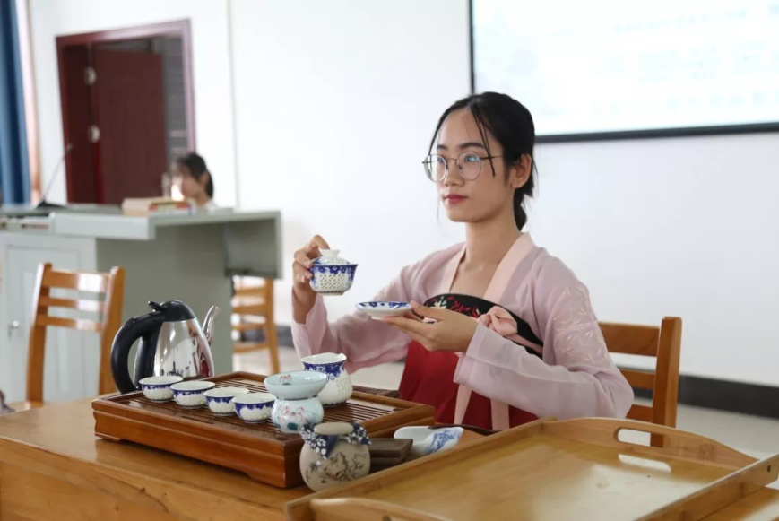 讲座开始前,首先由学校汉服社的汉服爱好者身着襦裙、袄裙、衫子、圆领袍等不同款式的汉服,展示了汉民族服饰的文化。随后,茶艺社的同学带来优美的茶艺表演,在悠扬的配乐与茶艺社同学的详尽的讲解中,二名同学动作优雅的向大家介绍了茶道的基本知识并展示了中国传统茶道的完整过程。