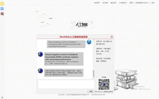 worldlib人工智能在线咨询是一款以网页和微信为载体,运用最新网络技术整合多个搜索引擎为广大师生提供外文文献获取的互联网在线服务平台。该平台支持关键词检索、题名检索(文献准确题名)、文献DOI号检索、文献PMID号检索、图片识别检索、作者检索。查询结果会在10秒内返回, 24小时不间断的提供文献查询服务。