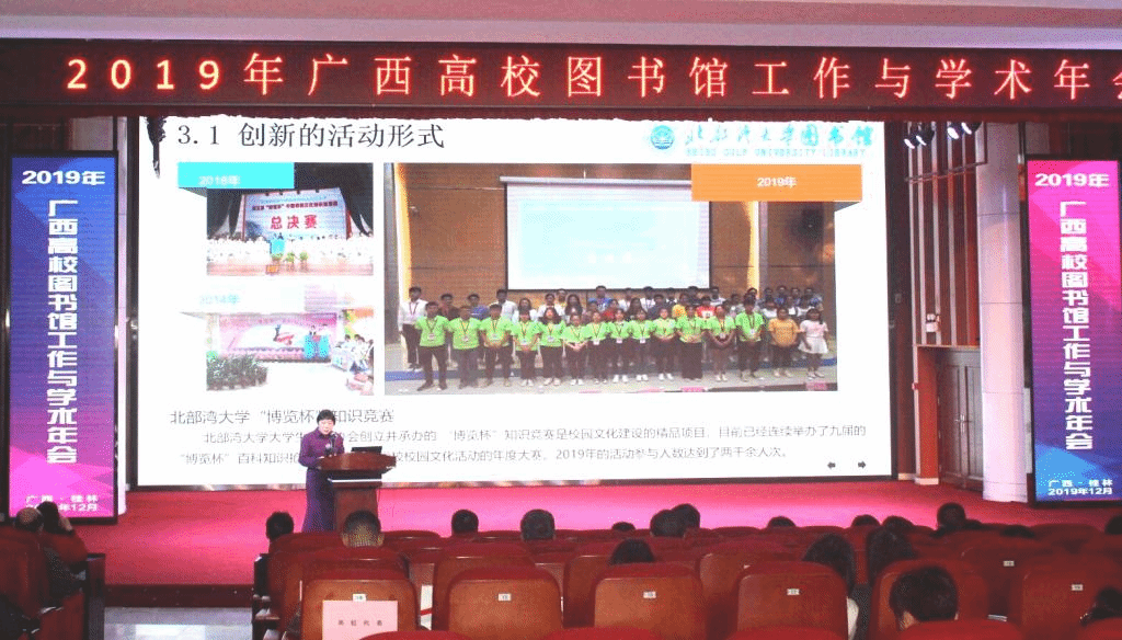 12月12日至14日,由广西本科高校图工委等主办、广西师范大学图书馆承办的2019年广西高校图书馆工作与学术年会在广西师范大学雁山校区召开。来自广西各高校图书馆负责人、骨干及入选征文作者代表等100多人参加了会议。我校图书馆副馆长陈一红一行3人参加了此次工作与学术年会。