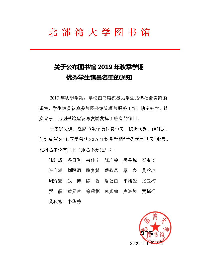 关于公布图书馆2019年秋季学期优秀学生馆员名单的通知