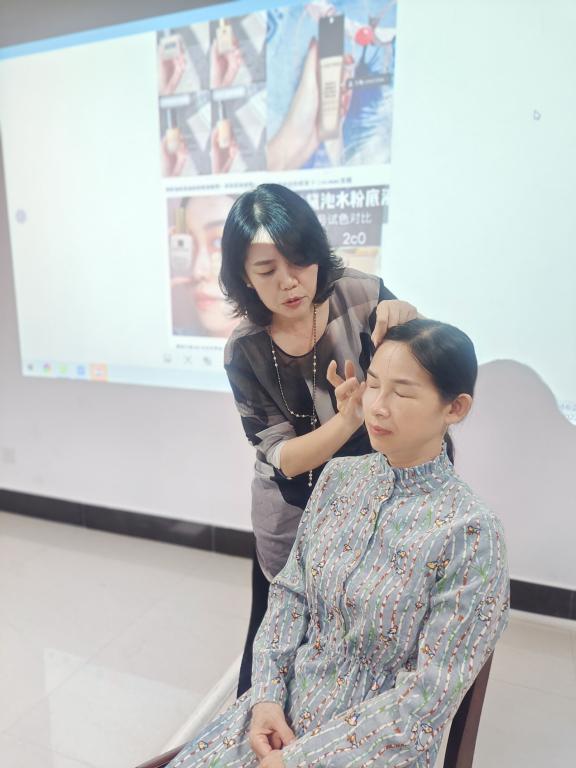 蒋映霞老师主要讲授“仪表——服饰搭配的知识和技巧”,她从年龄、职业和身材三方面进行分享,给馆员老师们在日常工作中的服饰搭配技巧提供了很好的建议。刘肖老师主要讲授“仪容——化妆培训”,并且还采用现场实操的方式指导馆员老师日常如何护肤,如何简易有效的化妆,希望老师们都能淡妆上岗,提升个人形象。