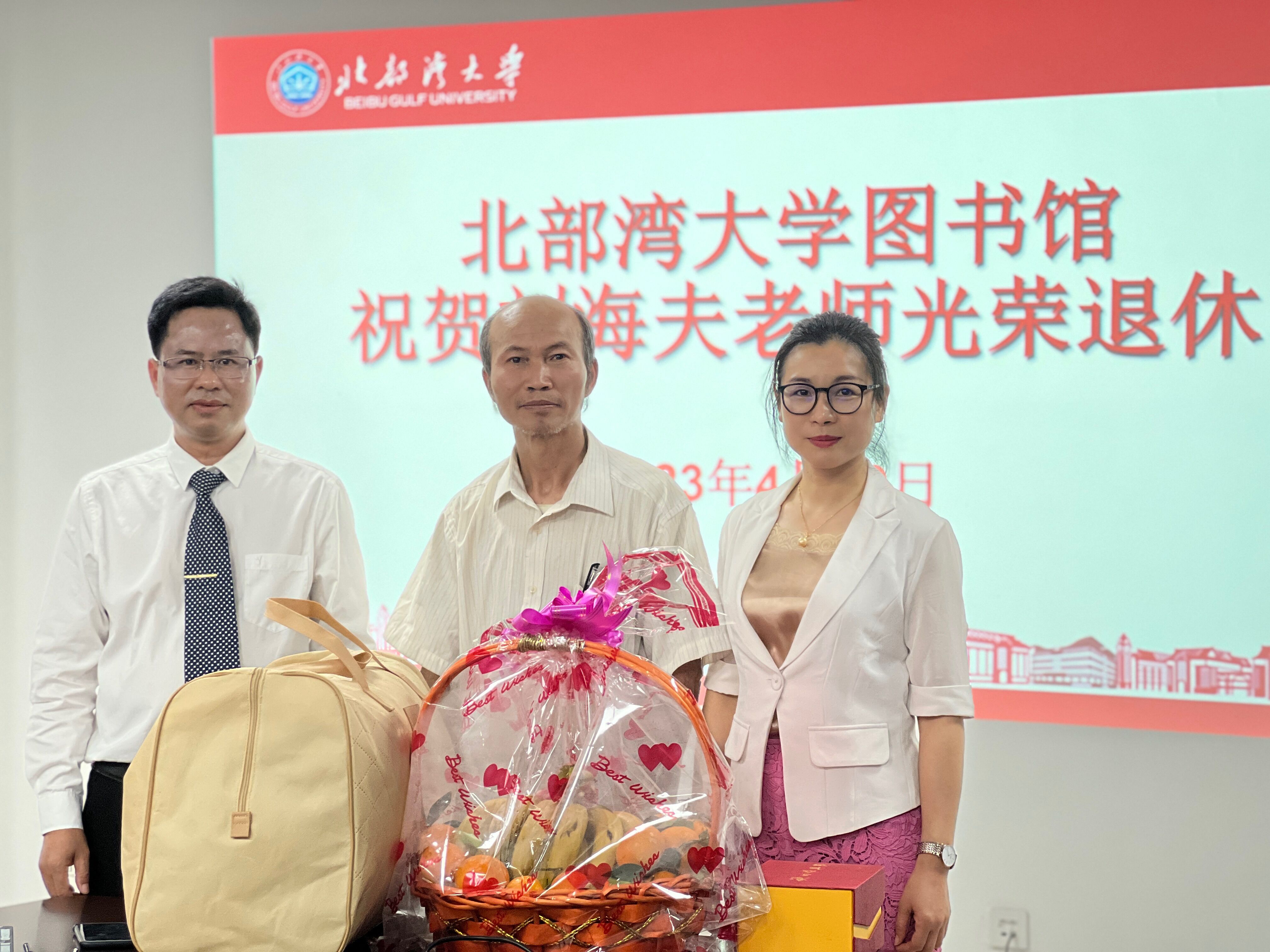 第三个议程是为即将退休的刘海夫老师举行简短的欢送仪式,两位馆领导肯定了刘海夫老师在我校工作中所做出的贡献并致以美好的祝福。