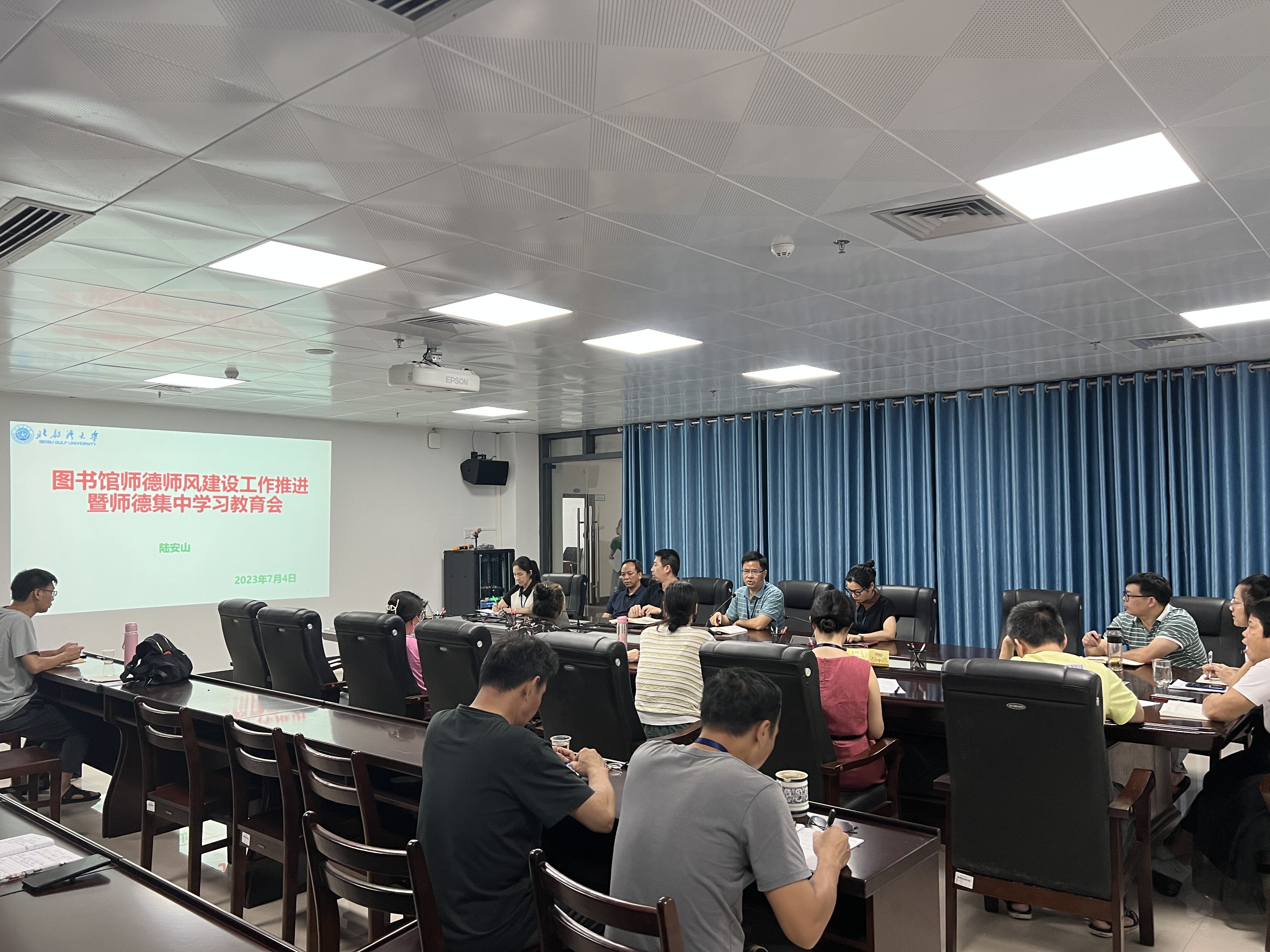 陆安山首先传达了学校师德师风建设工作推进暨师德集中学习教育会议精神,然后传达落实《北部湾大学师德集中学习教育工作方案》,最后开展了师德师风集中学习教育,他从习近平论教育工作、法律法规、警示教育三个方面带领大家全面认真的学习了专题内容。本次集中学习教育会旨在进一步加强我馆全体馆员老师的师德师风建设,提高教师职业道德素养,强化教师文明从教,廉洁从教,规范从教的职业意识,全面提升教师队伍整体素质。