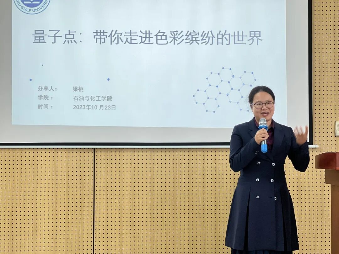 2023年10月23日下午,“阅读湾大”之探索神秘的科学世界分享会在图书馆众阅空间举行,石油与化工学院副教授梁桃、张斌斌分别进行主题为《量子点:带你走进色彩缤纷的世界》《碳:站在人类文明C位元素》的分享。来自全校各学院的80名师生参加本次活动。