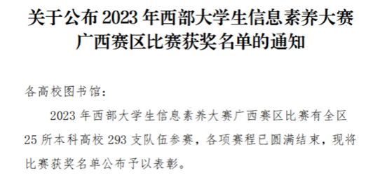 11月17日,2023年西部大学生信息素大赛广西赛区决赛落下帷幕,我校宁晓欣、郭婷婷、陈家贺三位同学组成的团队在决赛中发挥出色,在晋级决赛的全区各高校51个学生团队中,以总分第五名的成绩荣获二等奖。