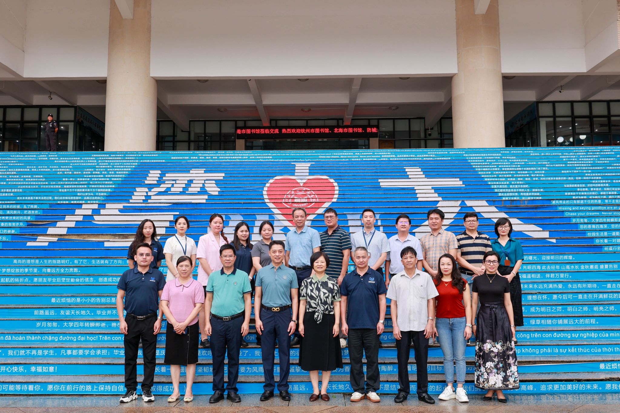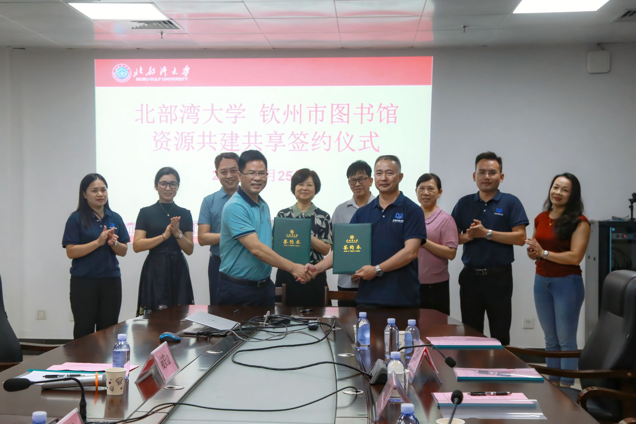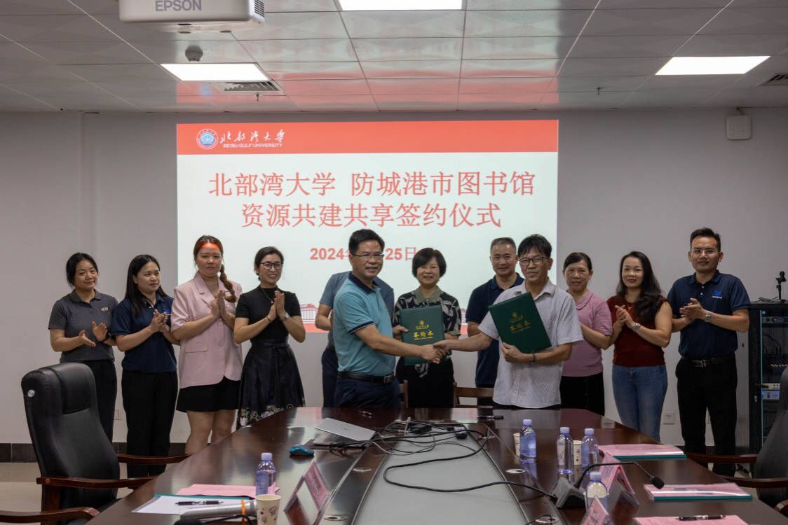 6月25日,北部湾大学与钦州市、北海市、防城港市图书馆成功举行了资源共建共享签约仪式。北部湾大学党委常委、副校长陈丹、北部湾大学图书馆馆长陆安山、副馆长翁少娟、钦州市图书馆馆长曾庆勇、副馆长覃德寿、北海市图书馆馆长李道海、副馆长陈宗雁、防城港市图书馆馆长黄海鸿、副馆长刘淑梅以及各馆馆员老师共计20人出席了签约仪式,共同见证了这一具有里程碑意义的时刻。